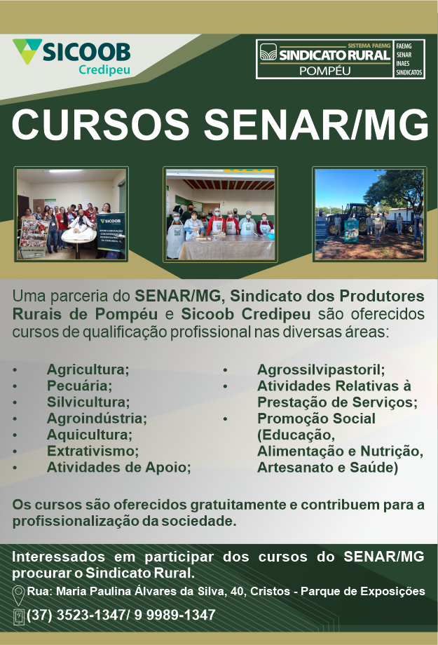 A parceria do SENAR com o Sindicato dos Produtores Rurais de Pompéu e o Sicoob Credipeu está cada dia mais forte mantendo o firme propósito de fortalecer o setor rural da região. Acreditando na capacitação como fator estratégico, a parceria é responsável pela promoção anual de uma robusta programação de cursos direcionados ao produtor rural, ao trabalhador rural e suas famílias.
