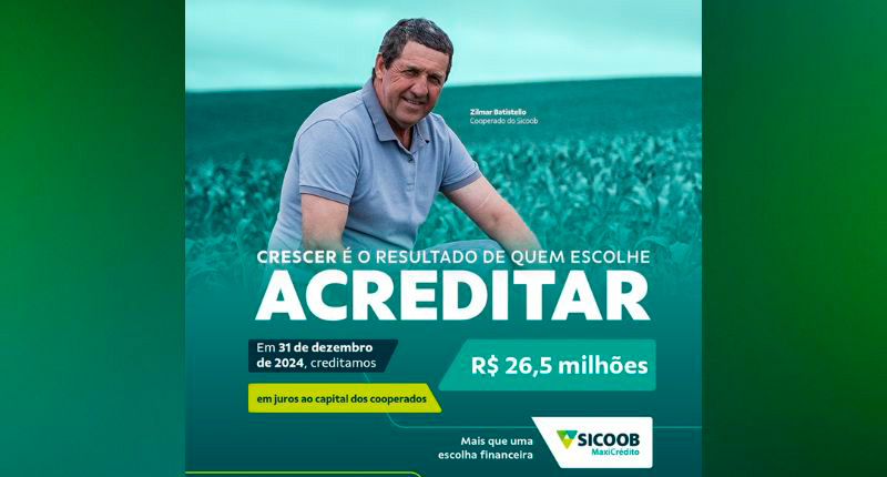 Ser mais que uma escolha financeira é promover um círculo virtuoso de prosperidade. É, através de soluções financeiras justas e competitivas, incentivar o desenvolvimento de pessoas e comunidades e, por meio da proximidade e confiança, ajudar a construir um futuro mais próspero. Com esse propósito, no dia 31 de dezembro de 2024, o Sicoob MaxiCrédito fez o pagamento de R$ 26,5 milhões em Juros ao Capital aos cooperados.