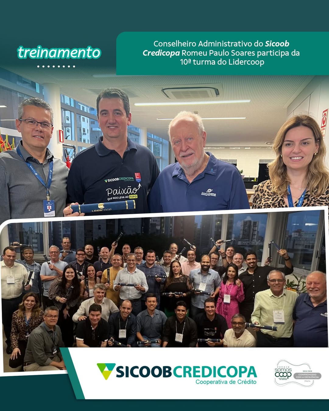 Conselheiro Administrativo do Sicoob Credicopa Romeu Paulo Soares Filho participou da 10ª turma do Lidercoop - um dos principais programas de educação do Sistema Ocemg, realizado em parceria com a Fundação Dom Cabral. Alta performance na capacitação de lideranças para que as cooperativas mineiras sigam em posição de destaque no cenário nacional.