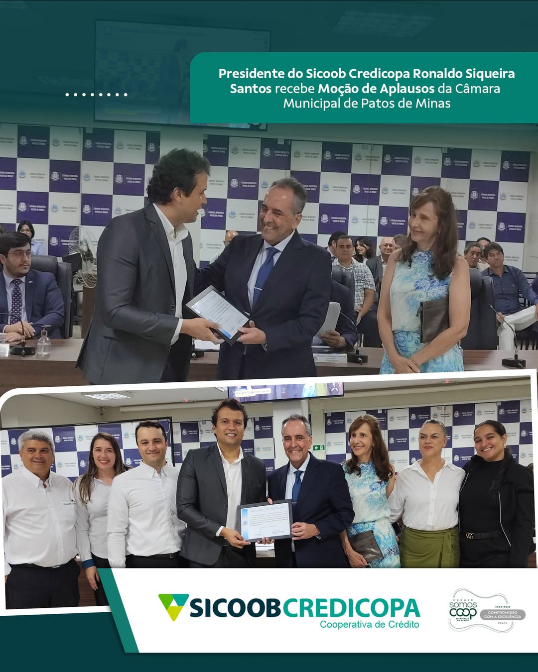 O Presidente do Sicoob Credicopa Ronaldo Siqueira Santos foi recentemente agraciado com uma Moção de Aplausos, da Câmara Municipal de Patos de Minas, um reconhecimento importante pelo seu trabalho à frente da cooperativa e sua contribuição significativa para o desenvolvimento econômico e social da cidade e região. A homenagem reflete o impacto positivo da sua gestão no fortalecimento da cooperativa e no apoio a milhares de cooperados.