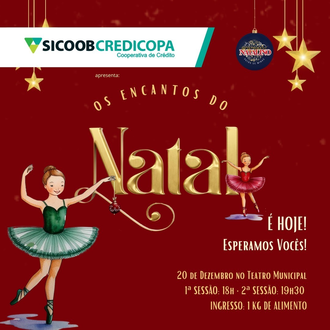 Venha prestigiar o espetáculo de dança "Os Encantos do Natal" dos alunos da Associação Vem Ser. Uma experiência mágica e emocionante para toda a família viver o verdadeiro espírito natalino no Renascer Natalino com amor, solidariedade e o encanto dessa época tão especial, às 19h30 no Teatro Municipal.