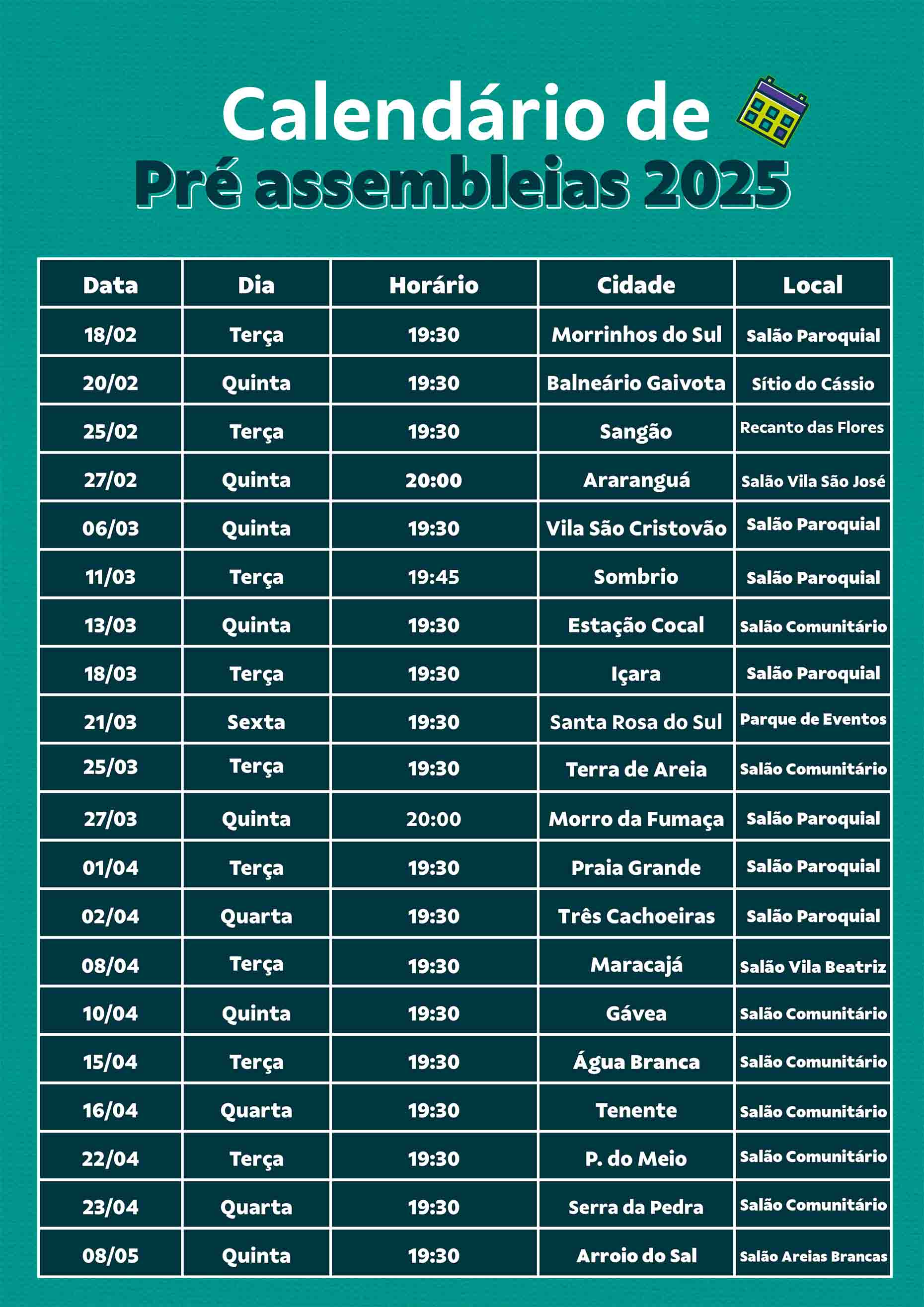 A Assembleia Geral Ordinária acontecerá no dia 25 de abril, às 19h30, no pavilhão do CDC (Campo Demonstrativo Cooperja), em Jacinto Machado. Nessa reunião são oficializadas as deliberações feitas nas pré-assembleias.