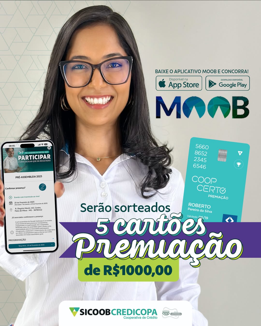 Baixe o aplicativo MOOB pelos links abaixo, participe online da Pré-Assembleia e concorra aos prêmios.