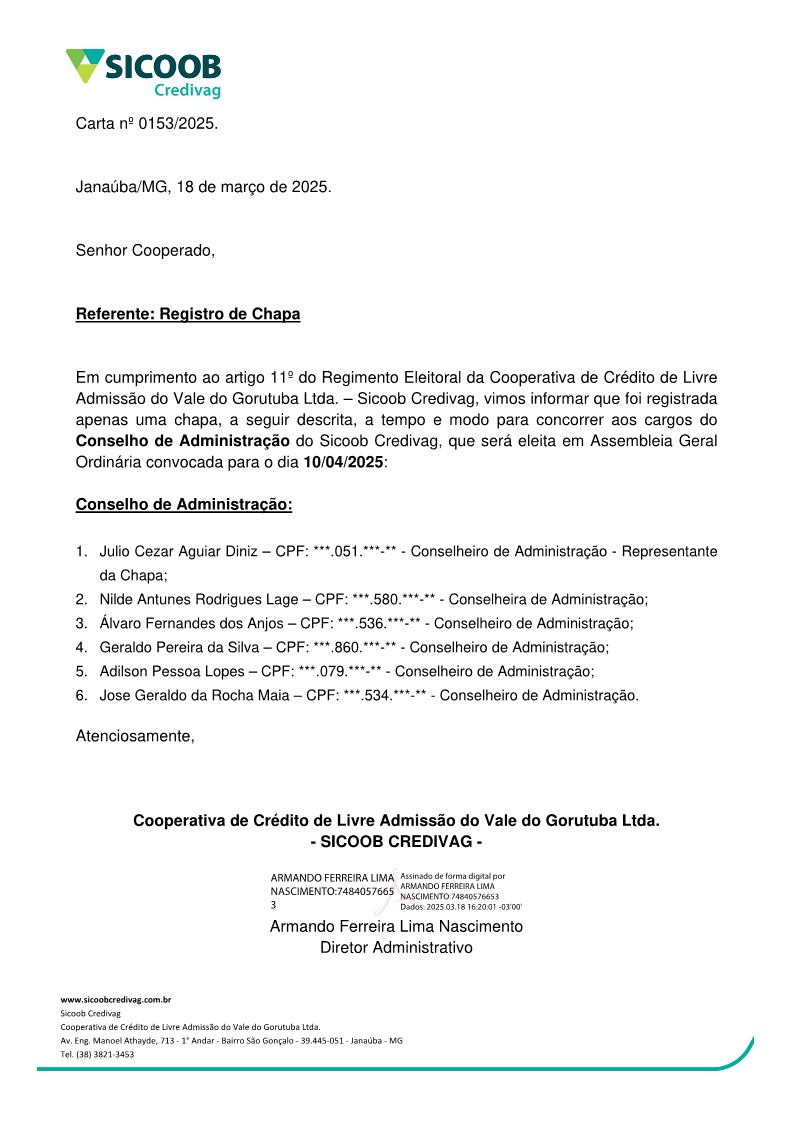Chapa registrada para concorrer aos cargos do Conselho de Administração na AGO de 10/04/2025.