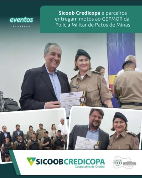 Em uma ação coletiva, o Sicoob Credicopa, o Sicoob Credipatos e a Unicred entregaram no dia 26/03 três motocicletas que serão utilizadas pelo Grupo Especial para Prevenção Motorizada Ostensiva Rápida – GEPMOR da Polícia Militar de Patos de Minas.