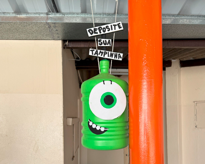 Na E.E. Prof.ª Maria Joaquina, fomos surpreendidos por um projeto inspirador: os alunos criaram personagens feitos a partir de galões reutilizados, espalhados pela escola para incentivar o descarte consciente de tampinhas plásticas. Esses personagens, além de promoverem educação ambiental de forma lúdica, funcionam como pontos de coleta que serão recolhidos pela própria ReciclaLeme, fechando um ciclo de cooperação entre comunidade, escola e cooperativa.