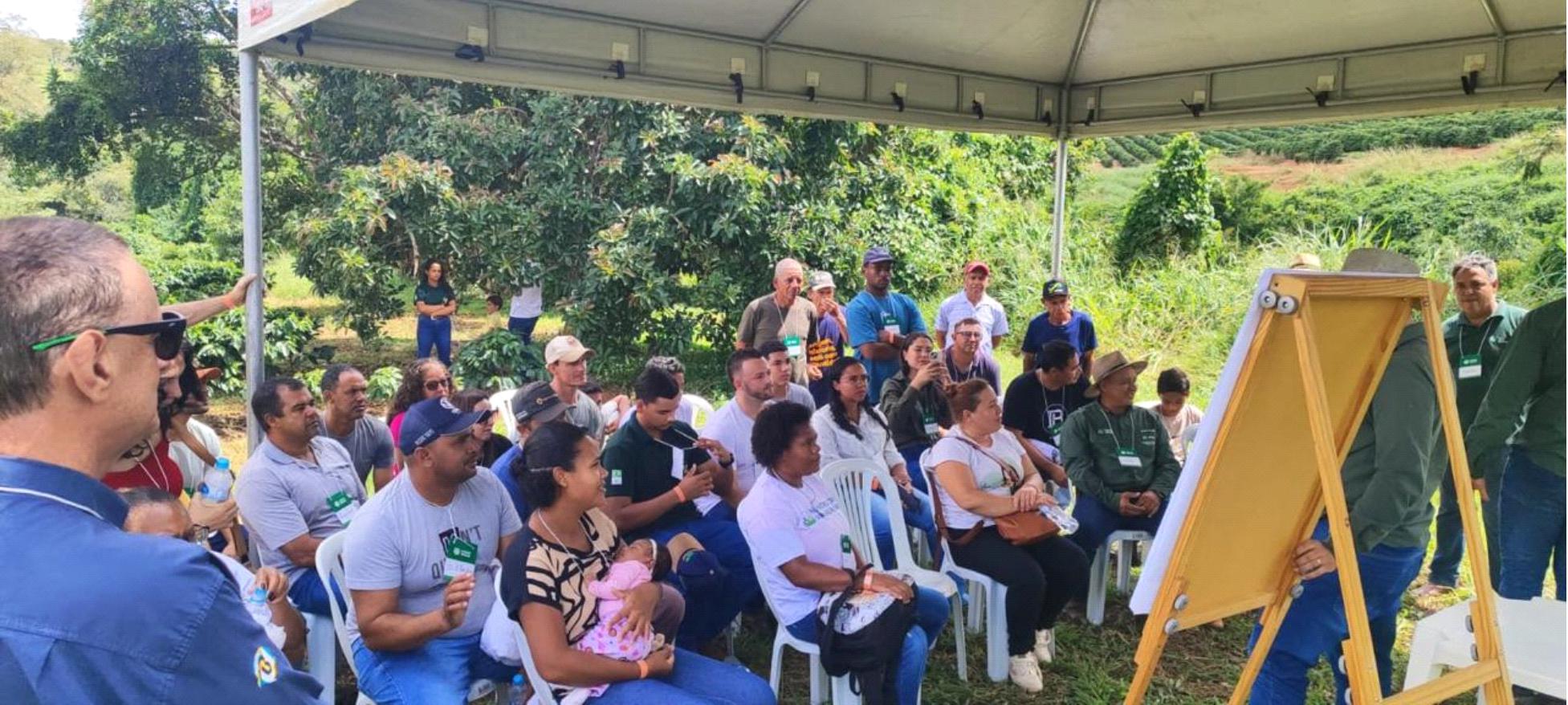 A programação teve início logo cedo, com credenciamento e coffee break, seguido da abertura oficial com representantes do Sistema Faemg Senar e do Sicoob Credivar. Em seguida, os participantes se deslocaram até a propriedade Sítio Tapete Verde, onde visitaram as Estações de Campo com foco em boas práticas no manejo da lavoura cafeeira.