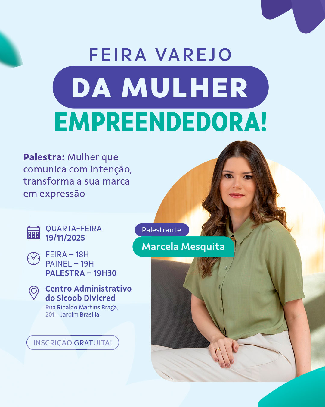O Sicoob Divicred realiza, através do Comitê de Mulheres, a Feira Varejo da Mulher Empreendedora, no dia 19 de novembro. A programação é gratuita e acontecerá no Centro Administrativo do Sicoob Divicred com início às 18h.