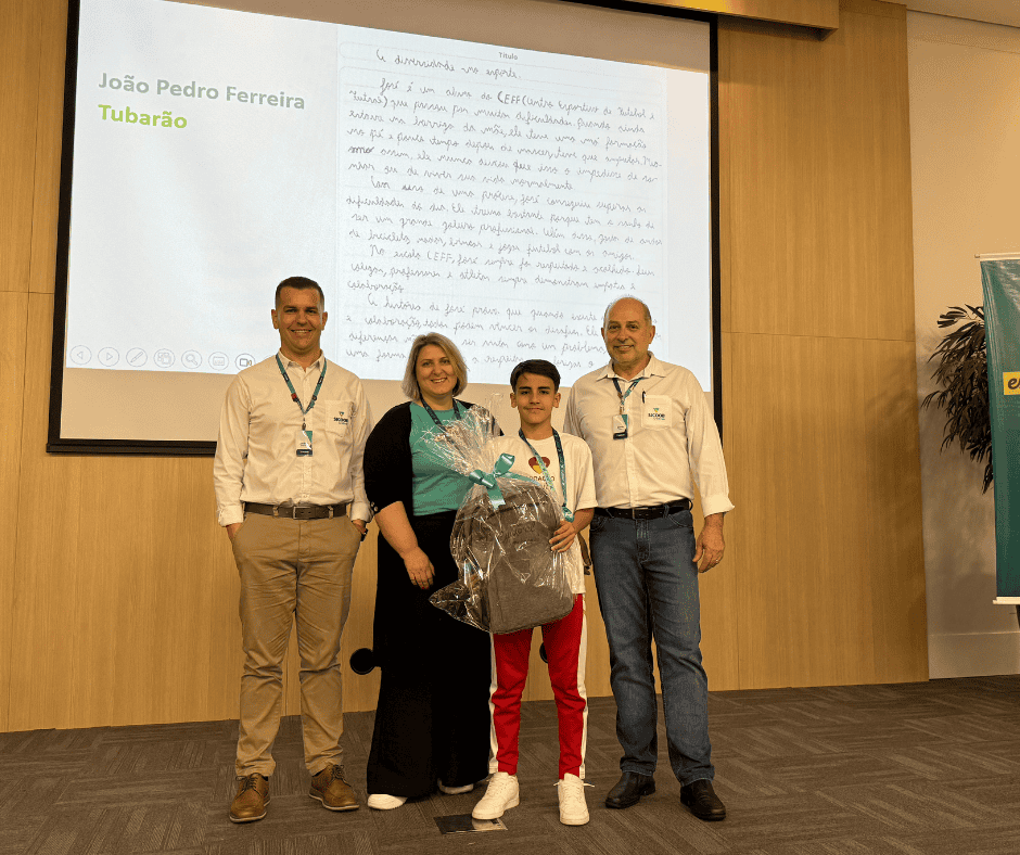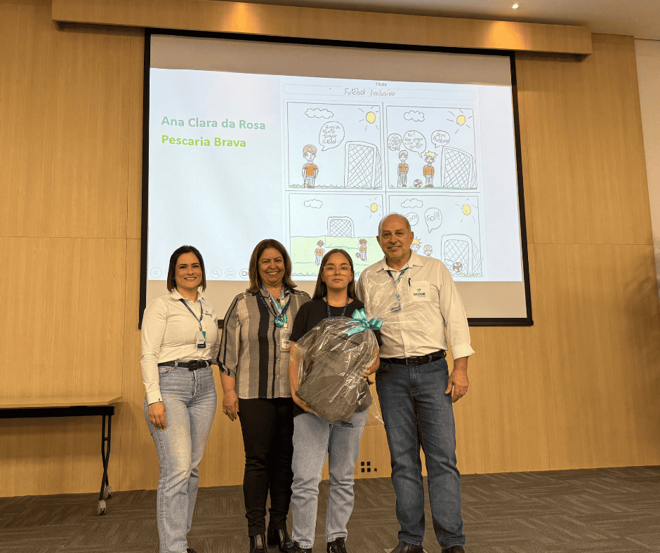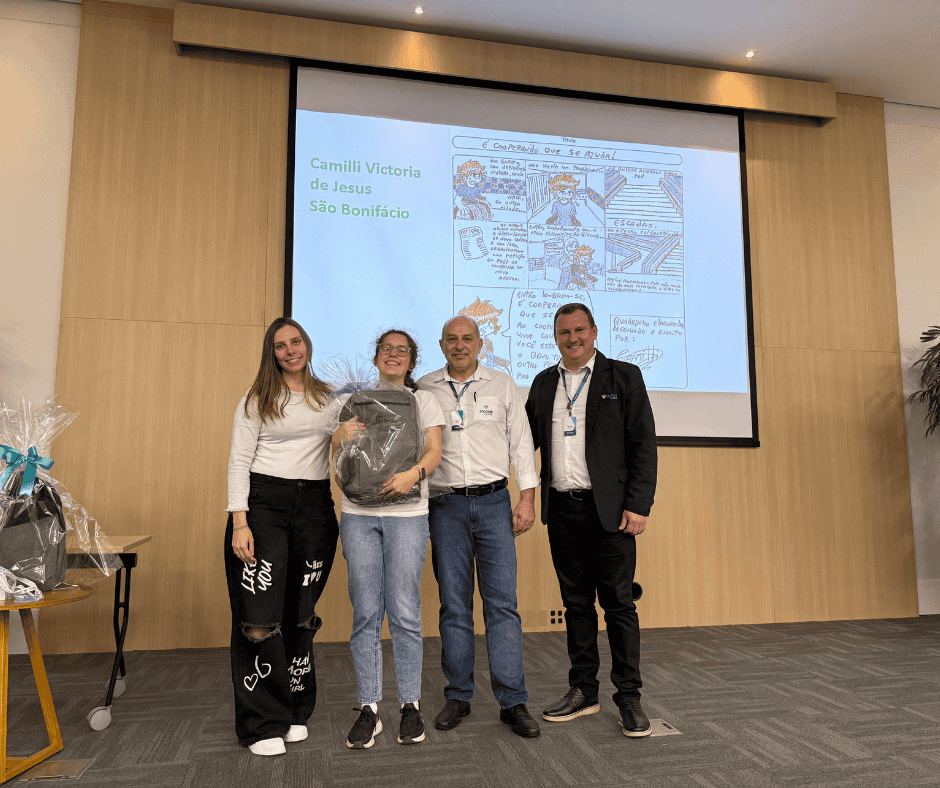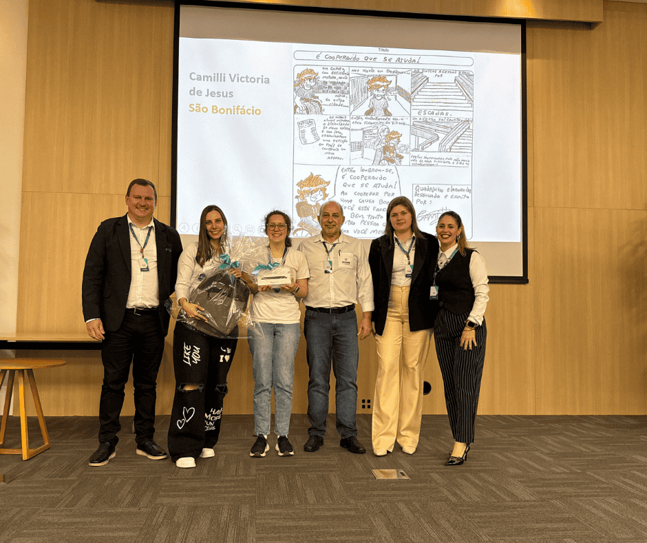 Com o tema “Diversidade que soma, cooperação que multiplica”, Camilli representou na tirinha o apoio do Sicoob na construção de uma rampa de acessibilidade na escola, para atender e incluir um aluno cadeirante. Na cerimônia de reconhecimento, a estudante recebeu um tablet como premiação, e sua professora orientadora, Carla Souza Effting, foi presenteada com uma mochila e uma medalha do Sicoob, em homenagem ao trabalho de incentivo e orientação.