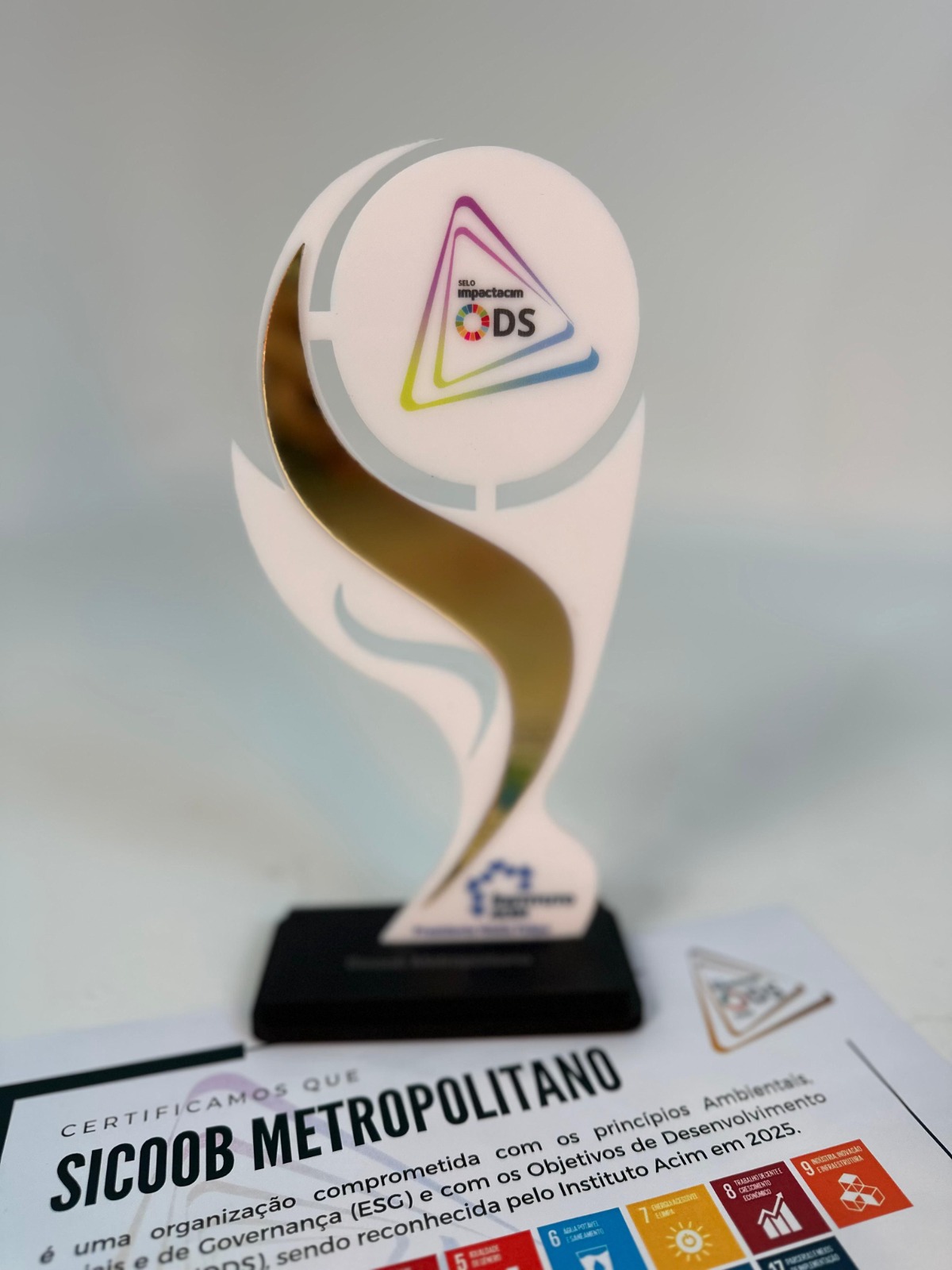 O Sicoob Metropolitano foi reconhecido, mais uma vez, com o Selo Impactacim ODS Ouro, concedido pelo Instituto ACIM de Responsabilidade Social. A certificação destaca empresas e organizações públicas e privadas que adotam práticas ESG e promovem ações consistentes para o alcance dos Objetivos de Desenvolvimento Sustentável (ODS), reforçando o compromisso com uma atuação ética, consciente e voltada ao futuro.