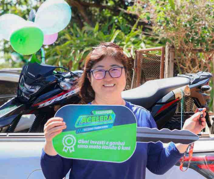 O Sicoob Credicarpa realizou, no último dia 12, o 3º sorteio da Promoção Acelera, iniciativa criada para incentivar o hábito do investimento e valorizar a participação dos cooperados da região. Nesta etapa, a contemplada foi Erica Tiemi Tomizawa, cooperada da agência Matriz de Carmo do Paranaíba, que recebeu uma Moto Honda NXR 160 Bros ESDD 0 km.