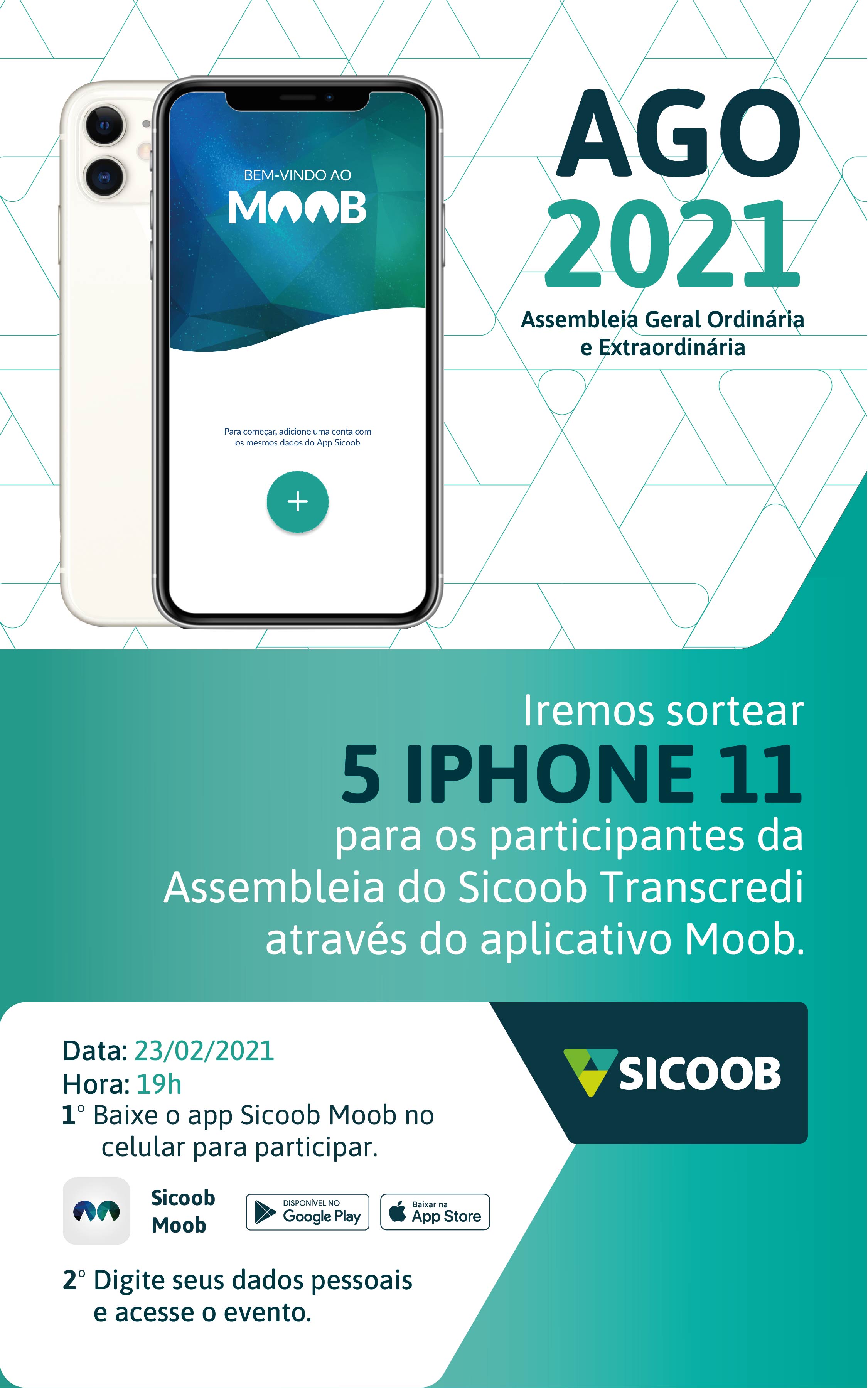 O Sicoob Transcredi realiza na noite de hoje a Assembleia Geral Ordinária e Extraordinária Digital. O encontro será às 19h de forma online através do aplicativo Sicoob Moob. Nesta ocasião, a cooperativa vai apresentar os principais números de 2020. Para incentivar a participação dos associados, a cooperativa irá sortear 5 Iphone 11 entre os cooperados que participarem de todas as votações.
