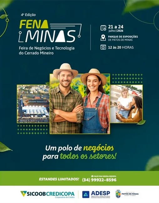A cidade de Patos de Minas se prepara para receber a quarta edição da FENAMINAS – Feira de Negócios e Tecnologia do Cerrado Mineiro, um dos maiores eventos empresariais da região. O encontro acontece de 21 a 24 de julho de 2026, no Parque de Exposições de Patos de Minas, e promete conectar empresas, produtores, empreendedores e instituições que impulsionam o agronegócio, a indústria e o varejo.