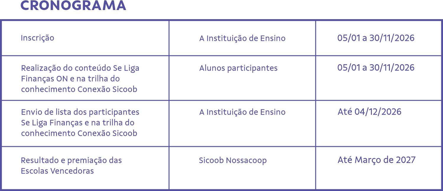 O Sicoob Nossacoop premiará a instituição de ensino que apresentar o melhor resultado, a ser medido pelo indicador “Taxa de Participação Total dos Participantes” no Programa Se Liga Finanças ON e na trilha do conhecimento do Conexão Sicoob.