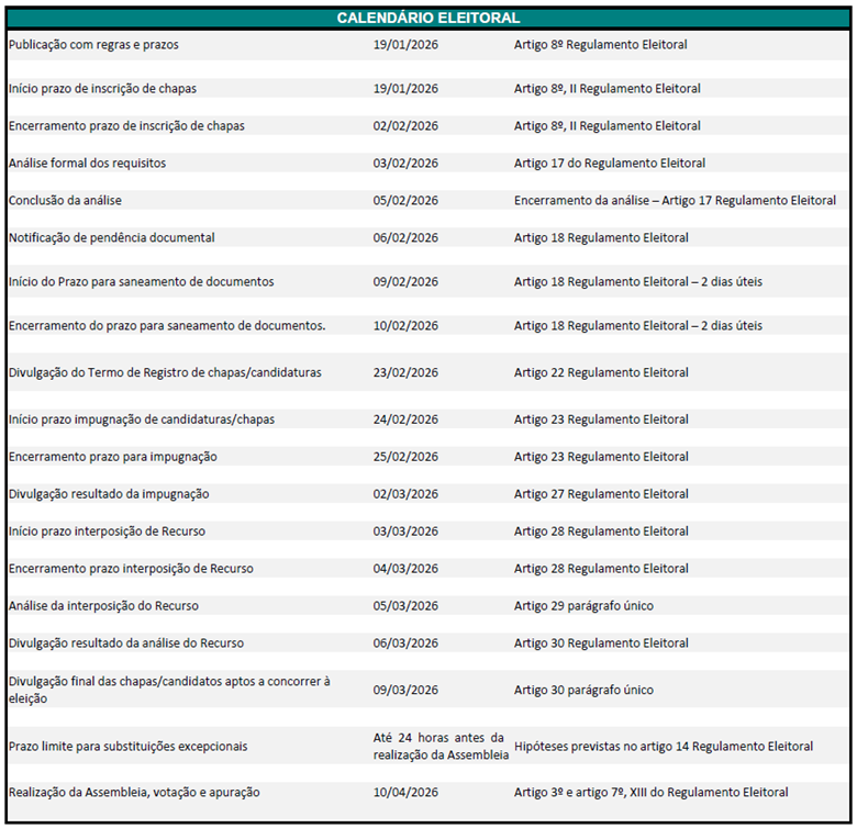 Na próxima Assembleia Geral Ordinária, com data prevista para 10 de abril de 2026, teremos eleição para o Conselho de Administração. O prazo para inscrição das respectivas chapas é até o dia 2 de fevereiro. A documentação e os anexos necessários estão disponíveis no nosso Regulamento Eleitoral. Confira o calendário eleitoral, com as datas completas: