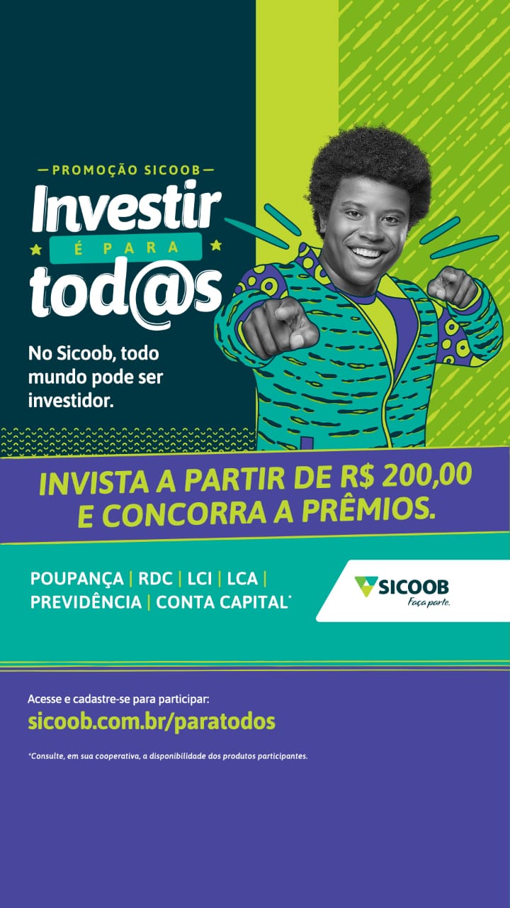O Sicoob promove de 6 de abril a 30 de junho deste ano a promoção Investir é para tod@s, que vai distribuir 60 prêmios no valor total de R$ 350 mil. Poderão participar pessoas física e jurídica. Os “números da sorte” serão gerados por número de inscrição no CPF ou de CNPJ e por cooperativa de vinculação.