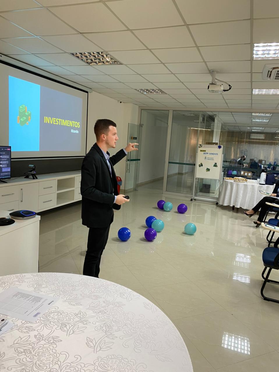 Os voluntários que coordenaram a palestra foram Josiane Bender e Ricardo Rossetto, e os temas abordados foram os princípios básicos de educação financeira e investimentos.