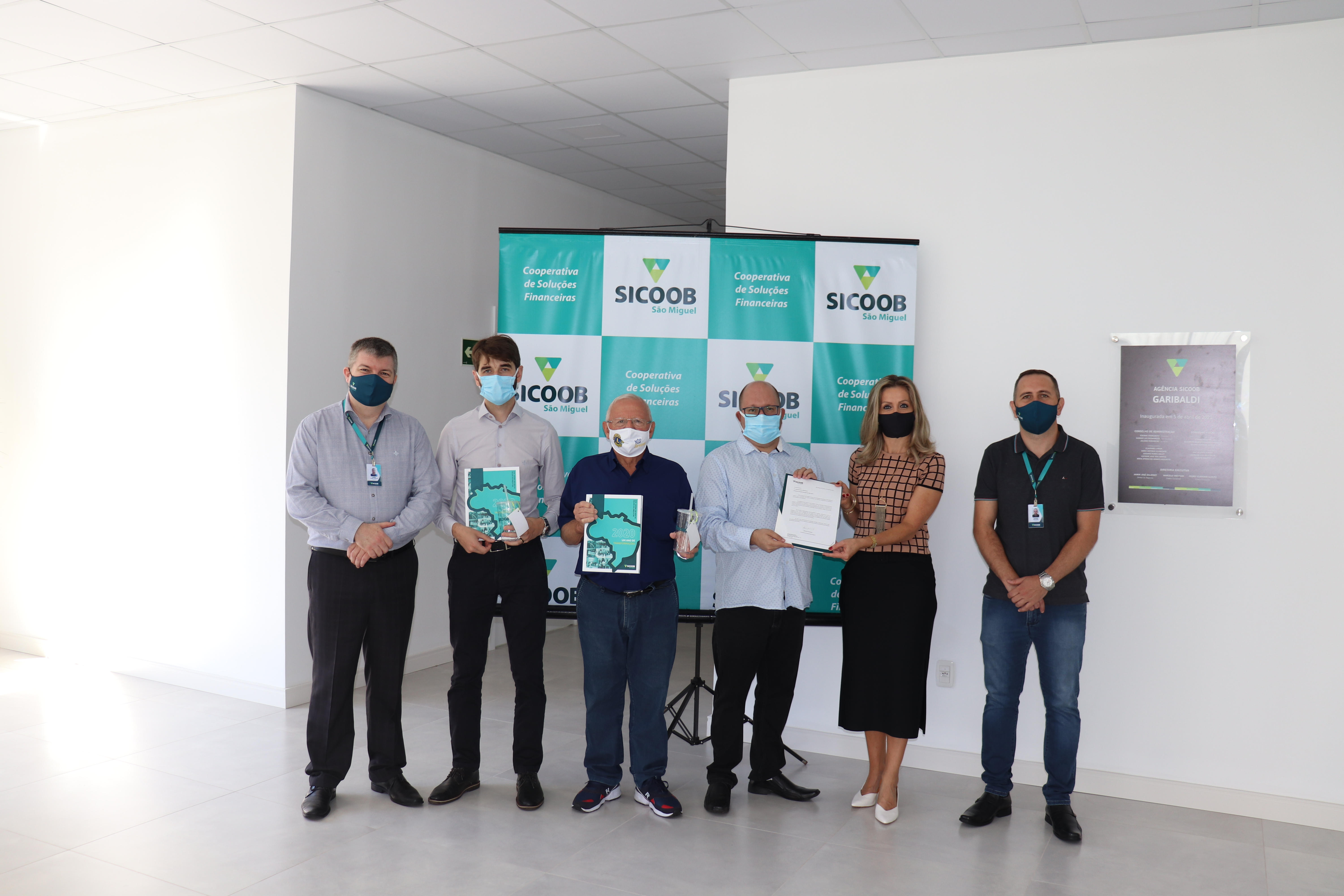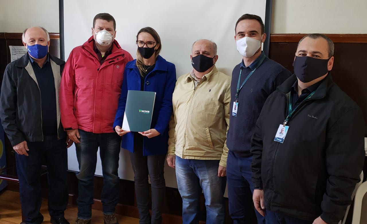 Foto: Jorge André Tischer, gerente do Sicoob em Garibaldi, Rangel Carissimi, diretor administrativo, Adorino Martinazzo, presidente do Hospital São Pedro, Jaime Kurmann, diretor geral, Marisa Cislaghi, diretora executiva do Sicoob, Thiago Welchen, gerente regional do Sicoob.