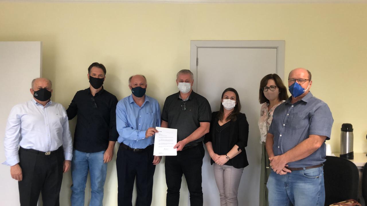 Foto: Jaimir Balbinot, diretor operacional do Sicoob, Edson Horst, conselheiro da ABOB, Edemar Fronchetti, presidente do Sicoob, Marco Aurélio Weber, presidente ABOB, Jaqueline Herrmann da Silva, gerente do Sicoob, Margarete Elisa Mallmann, vice-tesoureira da ABOB e Rucart Stapenhorst, vice-presidente da ABOB.