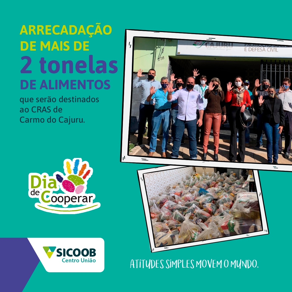 Este foi o caso da Campanha de Doação de Cestas Básicas realizada em Carmo do Cajuru em comemoração ao DIA C 2021. Do dia 01 a 30 de junho as principais cooperativas do município, Sicoob Centro União, Unimed Divinópolis, Copertecc, Copracal e Sicoob Divicred se uniram para angariar doações de alimentos para doar ao CRAS – Centro de Referência da Assistência Social de Carmo do Cajuru.