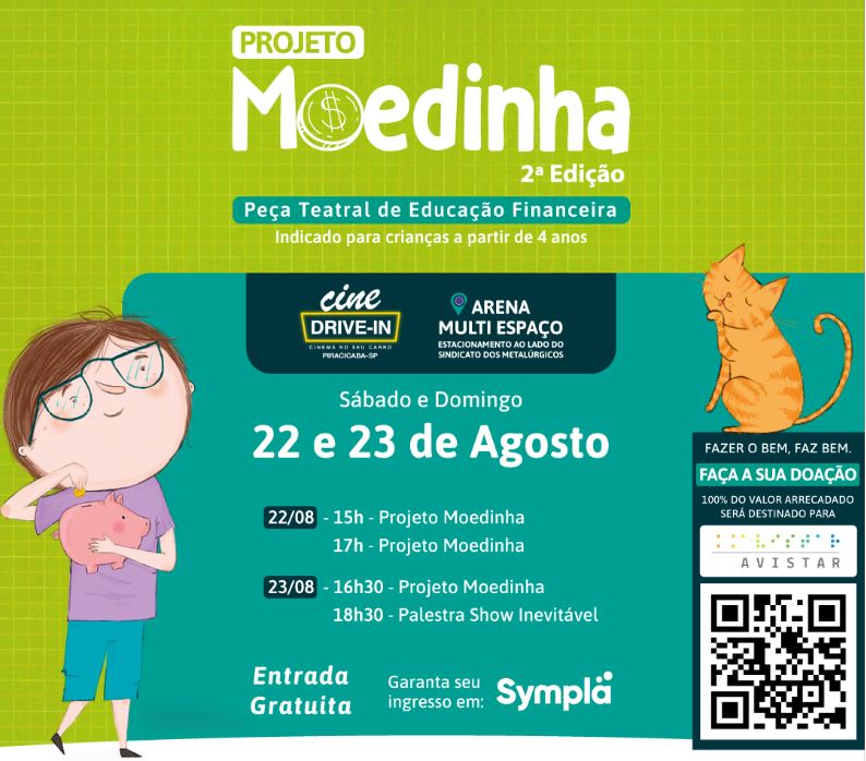 O Sicoob Cocre realiza, nos próximos dias 22 e 23 de agosto a apresentação teatral “Moedinha”, no modelo Drive In, no Sindicato dos Metalúrgicos de Piracicaba. O espetáculo gratuito, destinado a crianças de 4 a 10 anos, e encenado pelo grupo teatral da Agência NCasting, é uma das etapas do projeto social de mesmo nome desenvolvido e lançado pela instituição em 2019, que tem como objetivo oferecer formação em educação financeira, cooperativista, ambiental e de cidadania a crianças da comunidade.