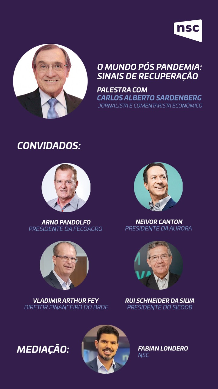 O evento será transmitido na plataforma do G1, nesta segunda-feira, 2 de agosto, a partir das 20 horas. Com mediação do apresentador e editor-chefe do NSC Notícias, Fabian Londero, os especialistas Arno Pandolfo, presidente da Fecoagro; Neivor Canton, presidente da Aurora; Rui Schneider da Silva, presidente do Sicoob SC/RS; e Vladimir Arthur Fey, diretor financeiro do BRDE, debatem o futuro da economia.
