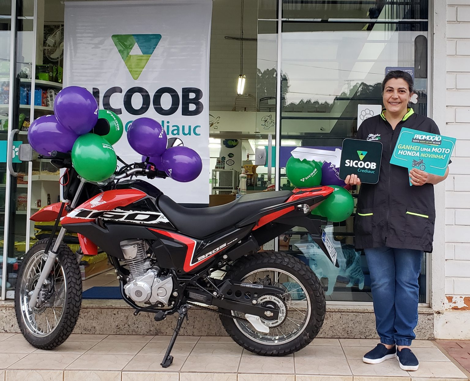 A cooperada do Sicoob Crediauc e sócia proprietária do Pet Shop Mania dos Bichos em Seara (SC), Rosana Maria Riviera Grando, ficou muito feliz quando viu chegar na terça, dia 13, em frente ao seu estabelecimento comercial, a caravana que percorreu as principais ruas da cidade e que conduzia o presente que a empresa acabara de ganhar da cooperativa. Funcionários da agência Centro do Sicoob foram os protagonistas da “surpresa”, entregando à proprietária do Pet Shop uma moto Honda NXR Bros zero quilômetro, da campanha “Sorte Assim Só no Sicoob” que distribuiu mais de R$ 5 milhões em prêmios a vários dos 5,2 milhões de associados do Sicoob espalhados pelo território nacional.