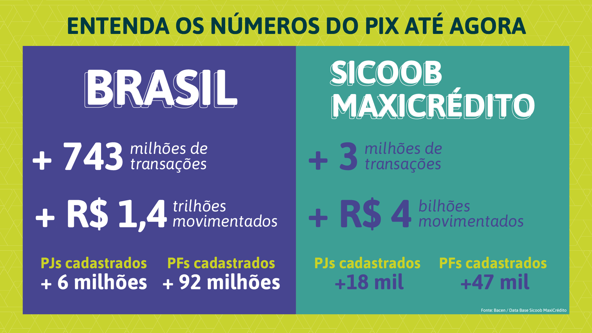 Há 254 dias o Brasil conheceu uma nova forma de enviar e receber dinheiro: o PIX. Menos de um ano de seu lançamento, as transações por PIX já superam as por cheque, boleto, TED e DOC. Dados do Banco Central (Bacen) apontam mais de 743 milhões de transações utilizando o método de pagamento instantâneo, movimentando mais de R$1,4 trilhões. No Sicoob MaxiCrédito, mais de 67 mil associados já cadastraram sua chave e estão usufruindo da praticidade e segurança do PIX. Você é um deles?
