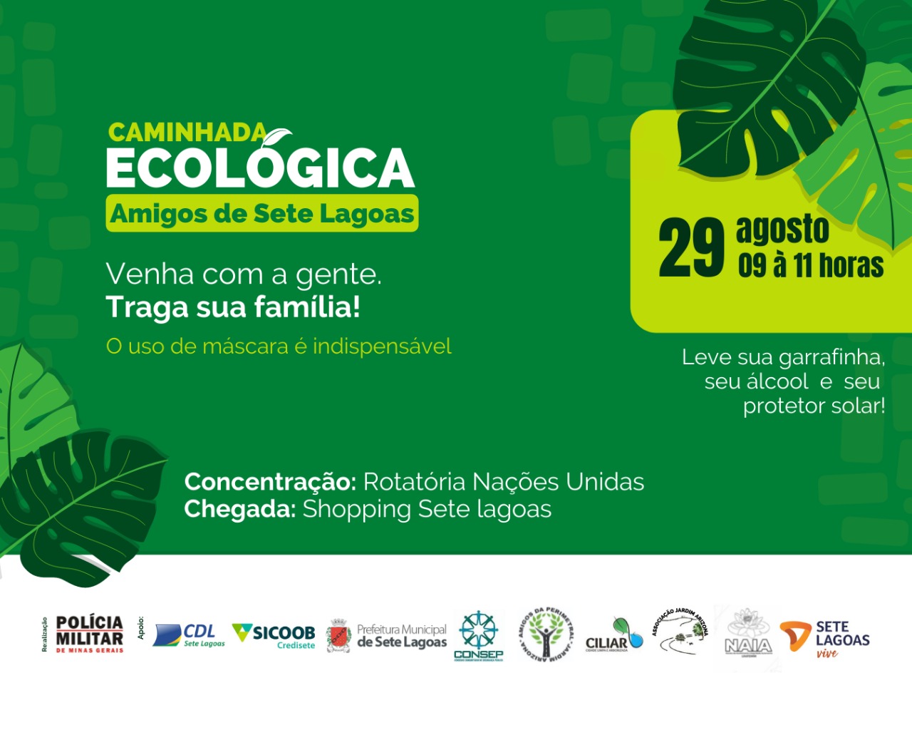 Numa realização da Polícia Militar, será realizada no próximo domingo, 29, a caminhada Ecológica “Amigos de Sete Lagoas”. A concentração será na rotatória da avenida Nações Unidas, bairro Jardim Arizona, com chegada no Shopping Sete Lagoas. O horário será 9h às 11h. Os organizadores solicitam que os participantes usem máscara e álcool gel para higienização das mãos. O evento tem o apoio do Sicoob Credisete.
