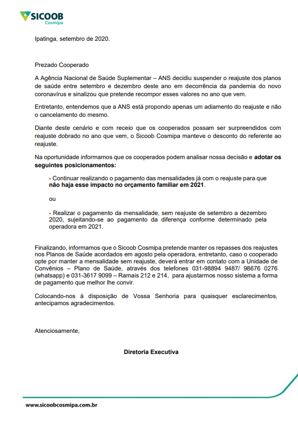 Finalizando, informamos que o Sicoob Cosmipa pretende manter os repasses dos reajustes nos Planos de Saúde acordados em agosto pela operadora, entretanto, caso o cooperado opte por manter a mensalidade sem reajuste, deverá entrar em contato com a Unidade de Convênios – Plano de Saúde, através dos telefones 031-98894 9487/ 98676 0276 (whatsapp) e 031-3617 9099 – Ramais 212 e 214, para ajustarmos nosso sistema a forma de pagamento que melhor lhe convir.
