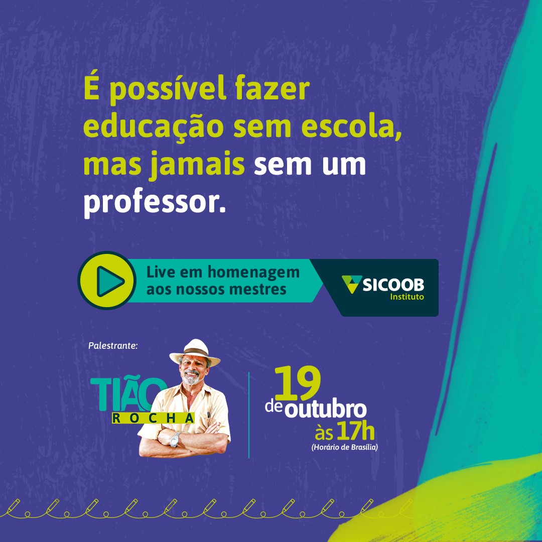 O Sicoob Fluminense será uma das cooperativas parceiras do Instituto Sicoob em evento comemorativo do Dia do Professor, 15 de outubro. No dia 19, às 17 horas, haverá uma live com palestra do especialista Tião Rocha voltada a todos os professores e educadores sociais beneficiados ou envolvidos com os programas sociais do Instituto, a exemplo da Cooperativa Mirim, Concurso Cultural, Financinhas, Palestras e Cooperjovem.