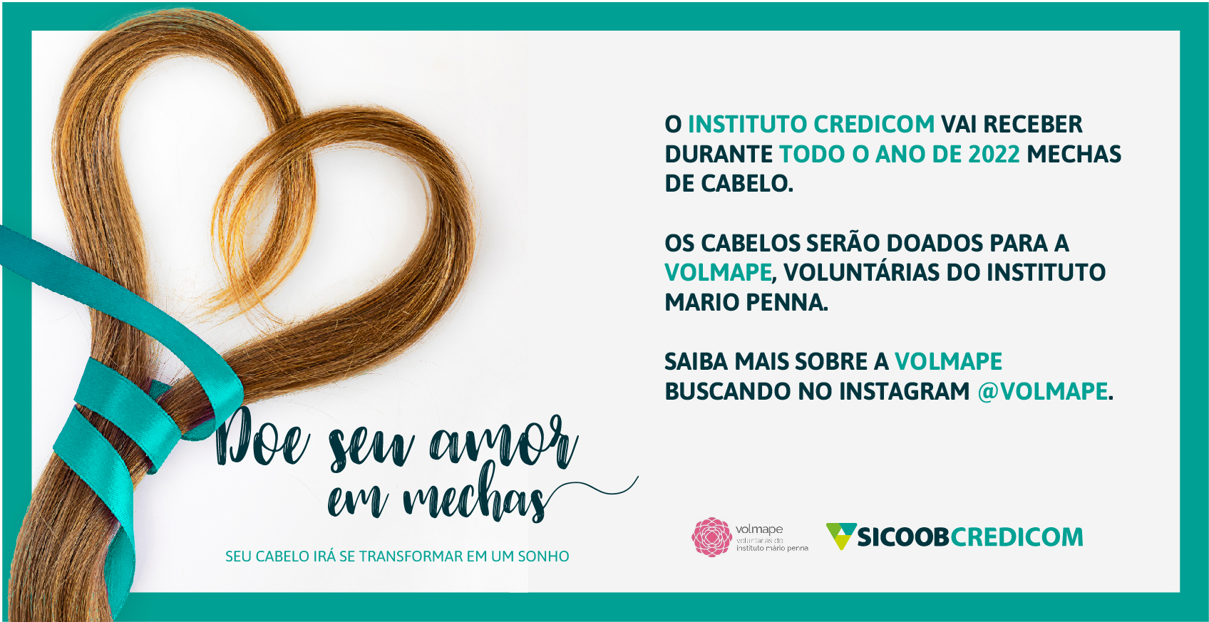 O Instituto Credicom vai receber durante o ano de 2022 mechas de cabelo. Os funcionários e cooperados que quiserem doar, podem entregar nas agências da Credicom ou na sede em Belo Horizonte. Os cabelos serão doados para a Volmape, voluntárias do Instituto Mario Penna. A Volmape é formada por um conjunto de voluntárias que recebem as doações das mechas e produzem as perucas para pacientes oncológicas de vários hospitais.