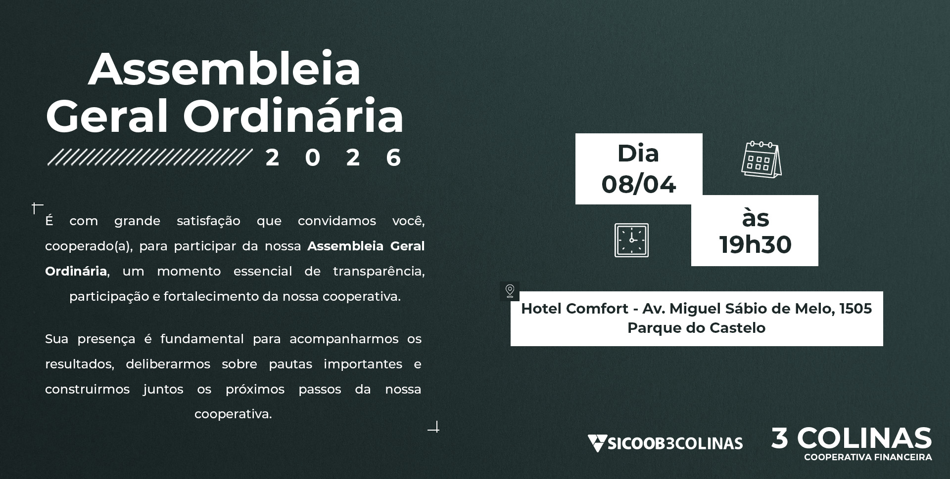 O Sicoob 3 Colinas convida você para participar da nossa Assembleia Geral Ordinária, um momento importante para acompanhar os resultados da cooperativa e participar das decisões que contribuem para o nosso crescimento.
