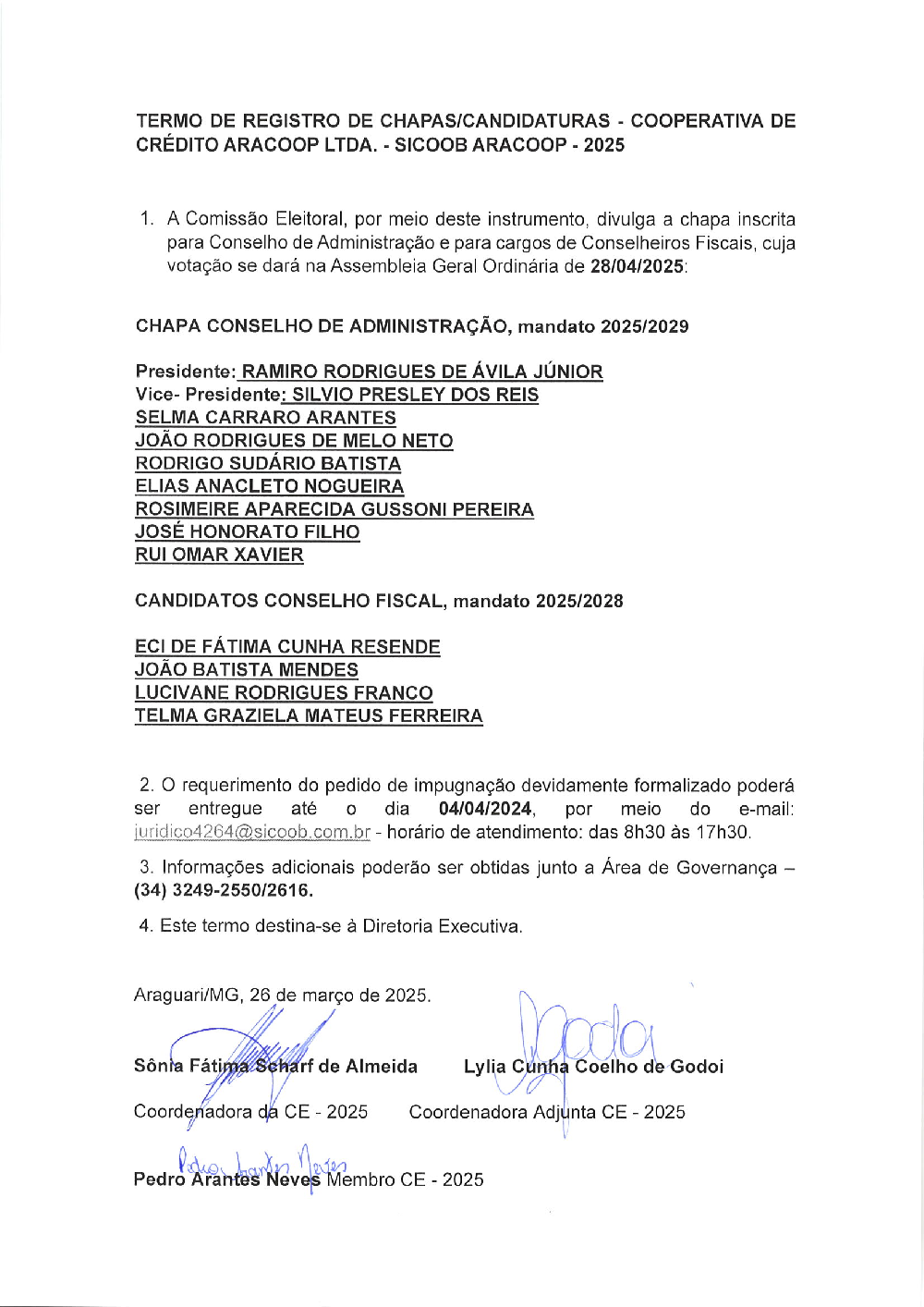 - Termo de registro de Chapas para Conselho de Administração (2025/2029) e para Conselho Fiscal (2025/2028).