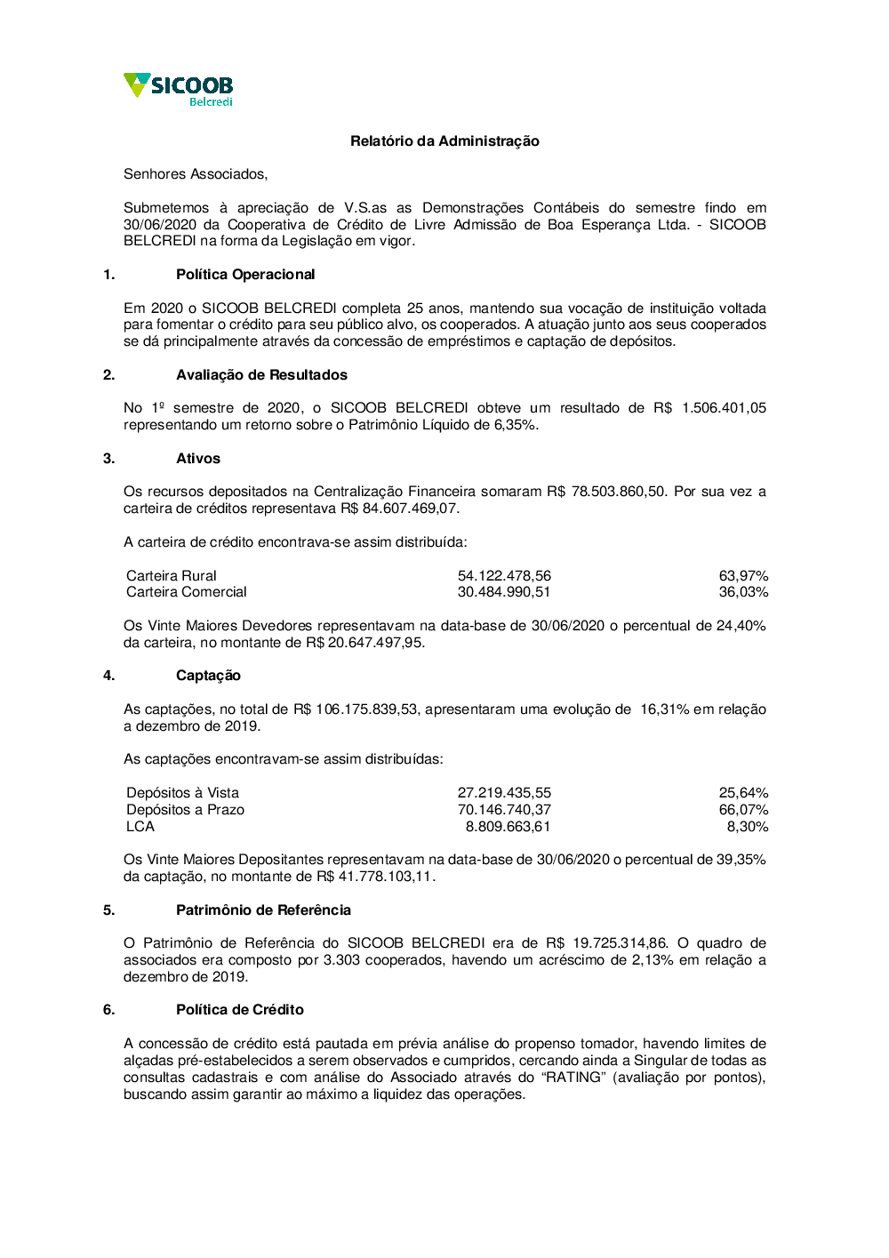 relatório da administração Cooperativa de Crédito de Livre Admissão de Boa Esperança Ltda