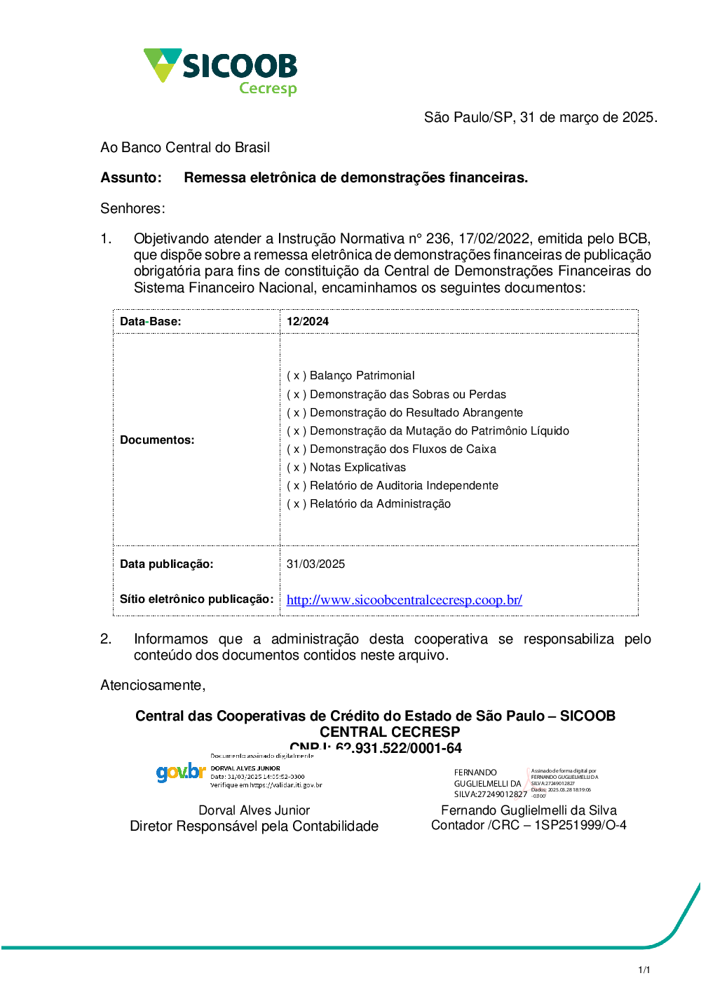 - Demonstrações Financeiras de 2024 do Sicoob Central Cecresp