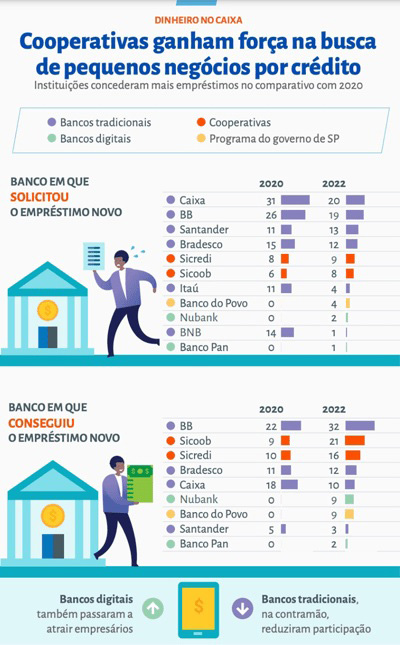 Para o presidente do Sebrae, Carlos Melles, os empreendedores estão buscando por alternativas menos burocráticas e onerosas de empréstimos, com taxas menores e menos exigências. “Bancos digitais e cooperativas de crédito têm sido fortalecidos neste momento em que os pequenos negócios buscam por saídas menos burocráticas, mais rápidas e mais baratas de empréstimo. Basta ver que as duas principais cooperativas de crédito do país, juntas, já superam a participação do BB no total de Pequenos Negócios atendidos, na concessão de crédito”, avalia.