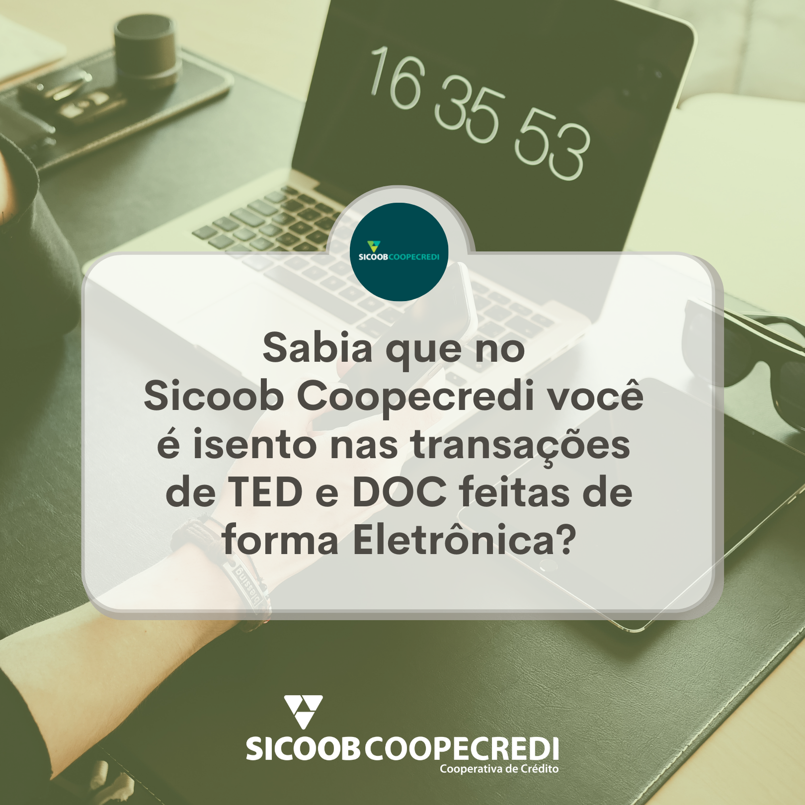 Enviando TED ou DOC de forma eletrônica, pelo App Sicoob, internet banking ou através dos caixas eletrônicos, você é isento da cobrança de qualquer taxa pela transação.
