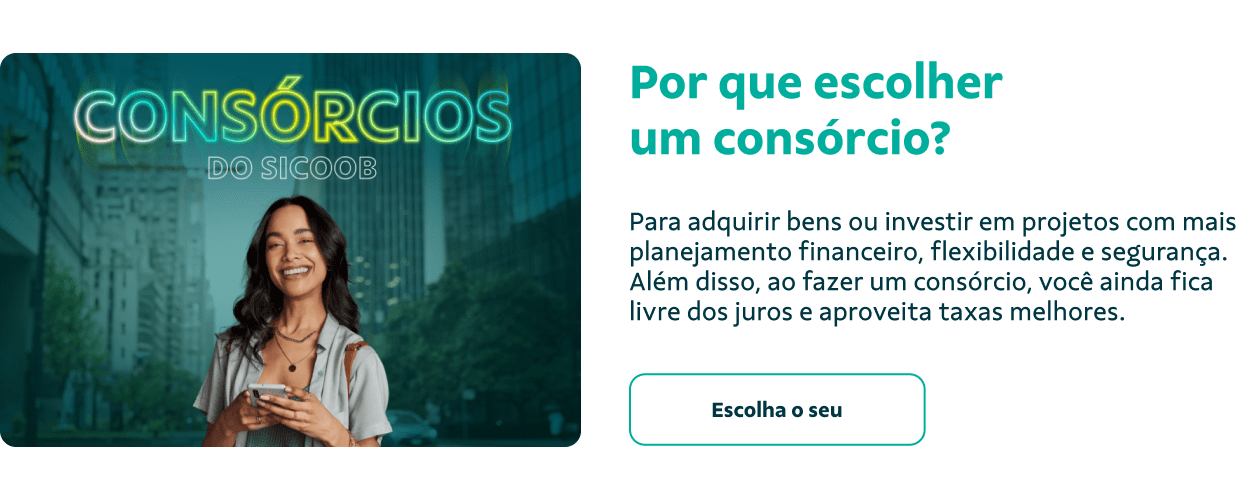 É muito fácil ser um de nossos consorciados. Você pode escolher através de uma das Cooperativas do Sicoob mais próxima de você ou mesmo pelo App Sicoob, disponível nas plataformas do Google Play e App Store.