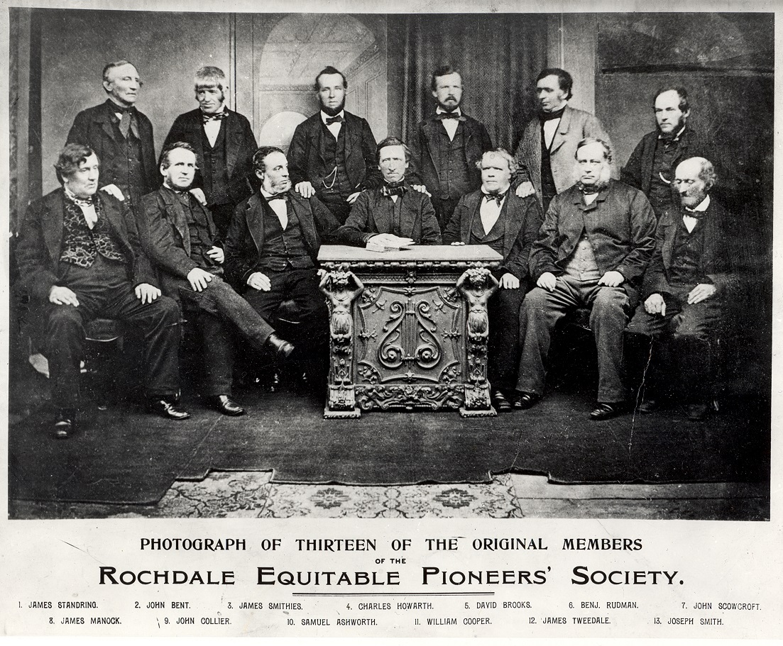Em 21 de dezembro de 1844 no bairro de Rochdale, em Manchester (Inglaterra), 27 tecelões e uma tecelã fundaram a "Sociedade dos Probos Pioneiros de Rochdale" com o resultado da economia mensal de uma libra de cada participante durante um ano. Tendo o homem como principal finalidade - e não o lucro, os tecelões de Rochdale buscavam naquele momento uma alternativa econômica para atuarem no mercado, frente ao capitalismo ganancioso que os submetiam a preços abusivos, exploração da jornada de trabalho de mulheres e crianças e do desemprego crescente advindo da revolução industrial.