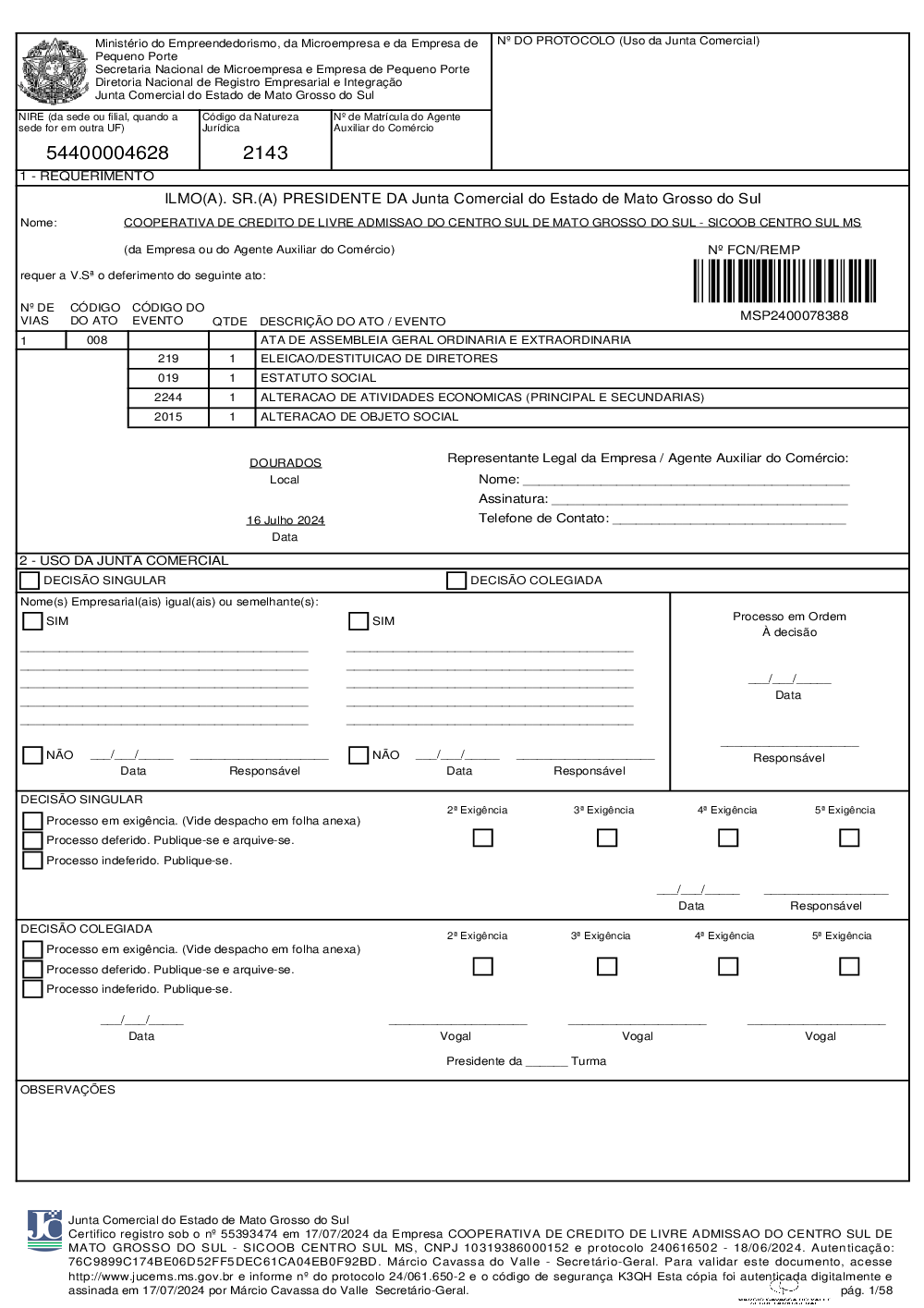 - Estatuto e Ata da Assembleia Geral 2024 do Sicoob Centro Sul MS