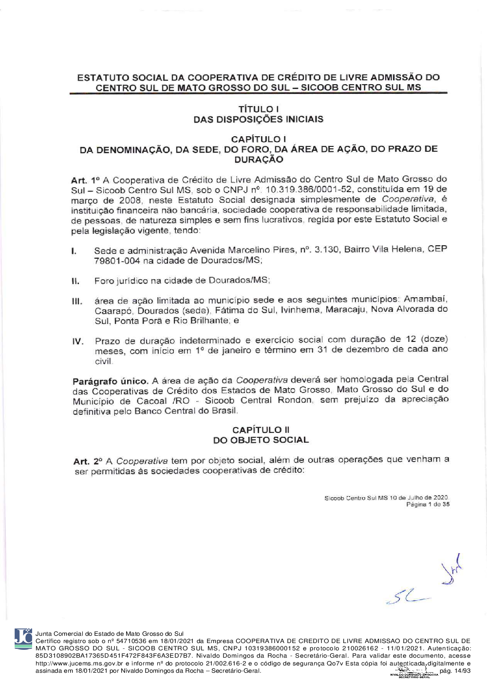 ESTATUTO SOCIAL DA COOPERATIVA DE CRÉDITO DE LIVRE ADMISSÃO DO CENTRO SUL DE MATO GROSSO DO SUL - SICOOB CENTRO SUL MS.pdf