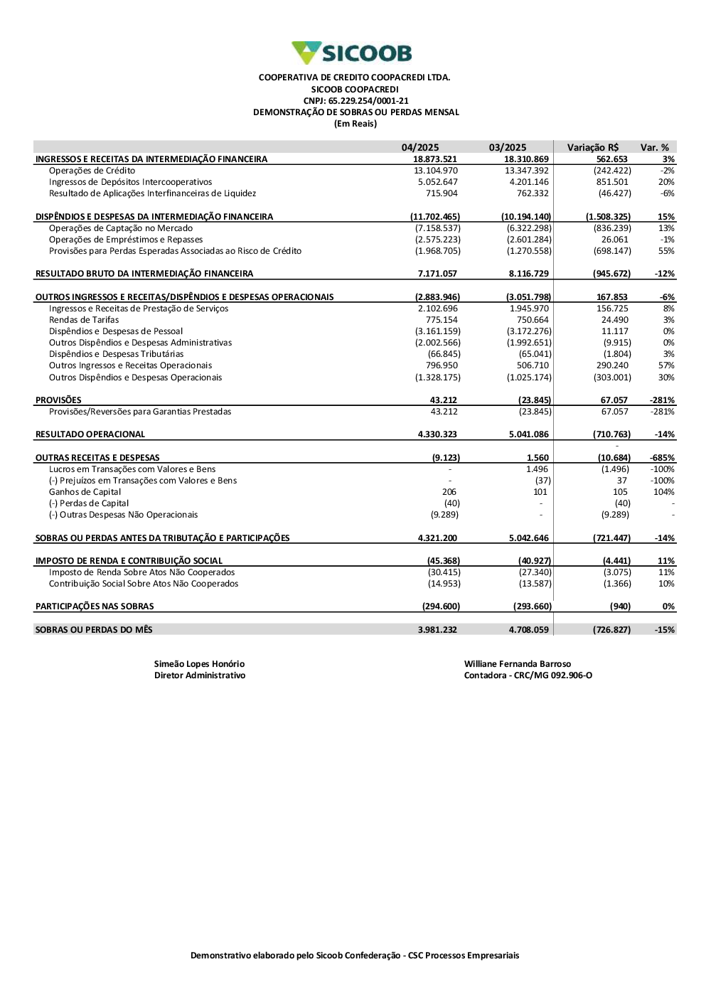 Demonstração Sobras ou Perdas 042025