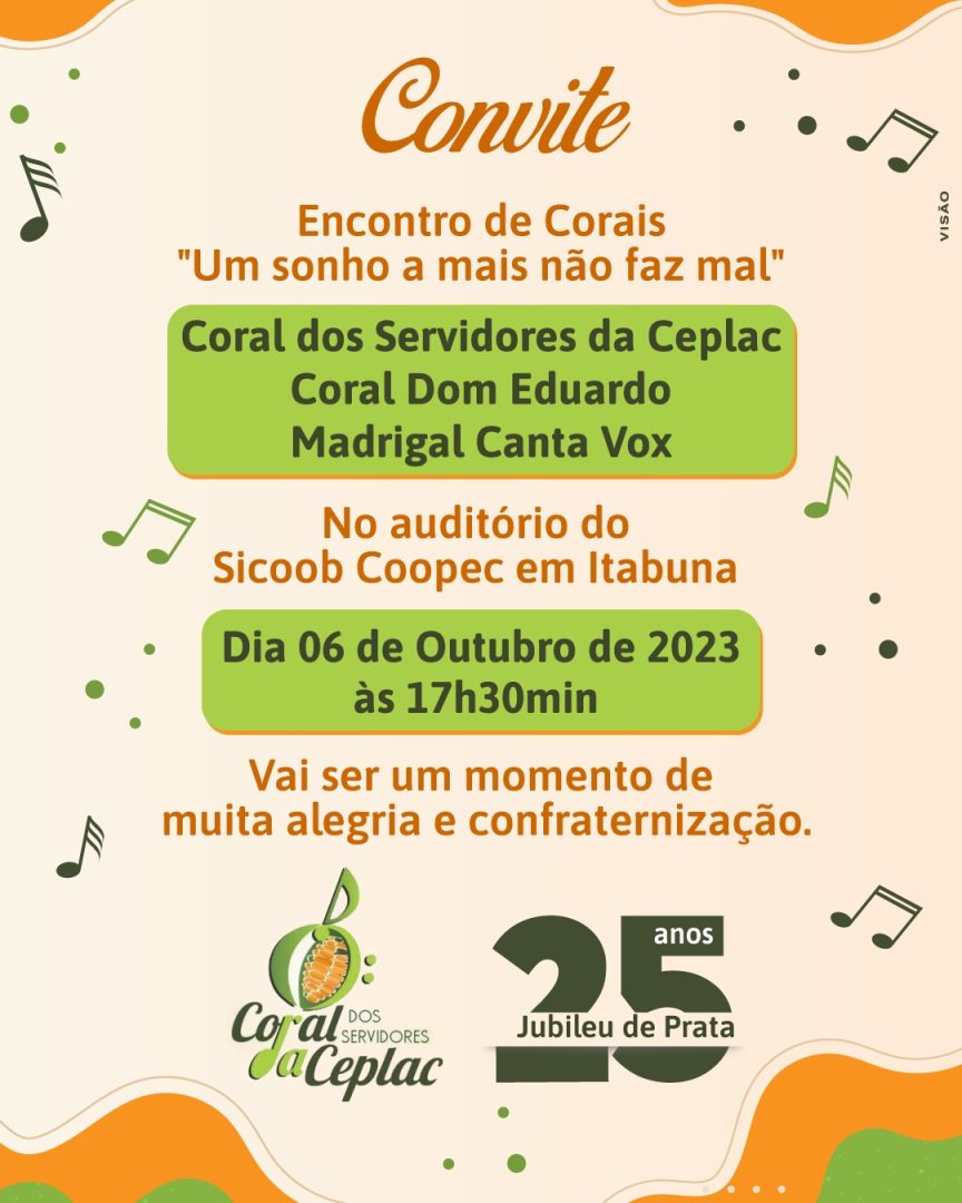 Aconteceu na última sexta-feira (06) às 18h no auditório do Sicoob Coopec, o Encontro de Corais denominado: "Um Sonho a mais não faz mal!" Esse Encontro fez parte da programação comemorativa aos 25 anos do Coral da Ceplac. O momento contou com a apresentação do Coral da Ceplac, do Coral Dom Eduardo e do Madrigal Canta Vox.
