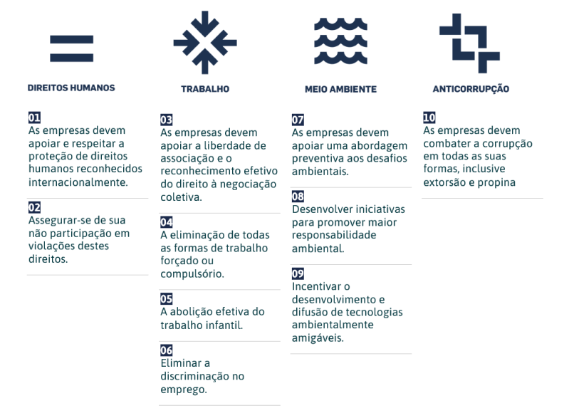 O Pacto Global é a maior iniciativa de sustentabilidade corporativa do mundo. É uma chamada para as empresas alinharem suas estratégias e operações aos Dez Princípios universais nas áreas de Direitos Humanos, Trabalho, Meio Ambiente e Anticorrupção e desenvolverem ações que contribuam para o enfrentamento dos desafios da sociedade.