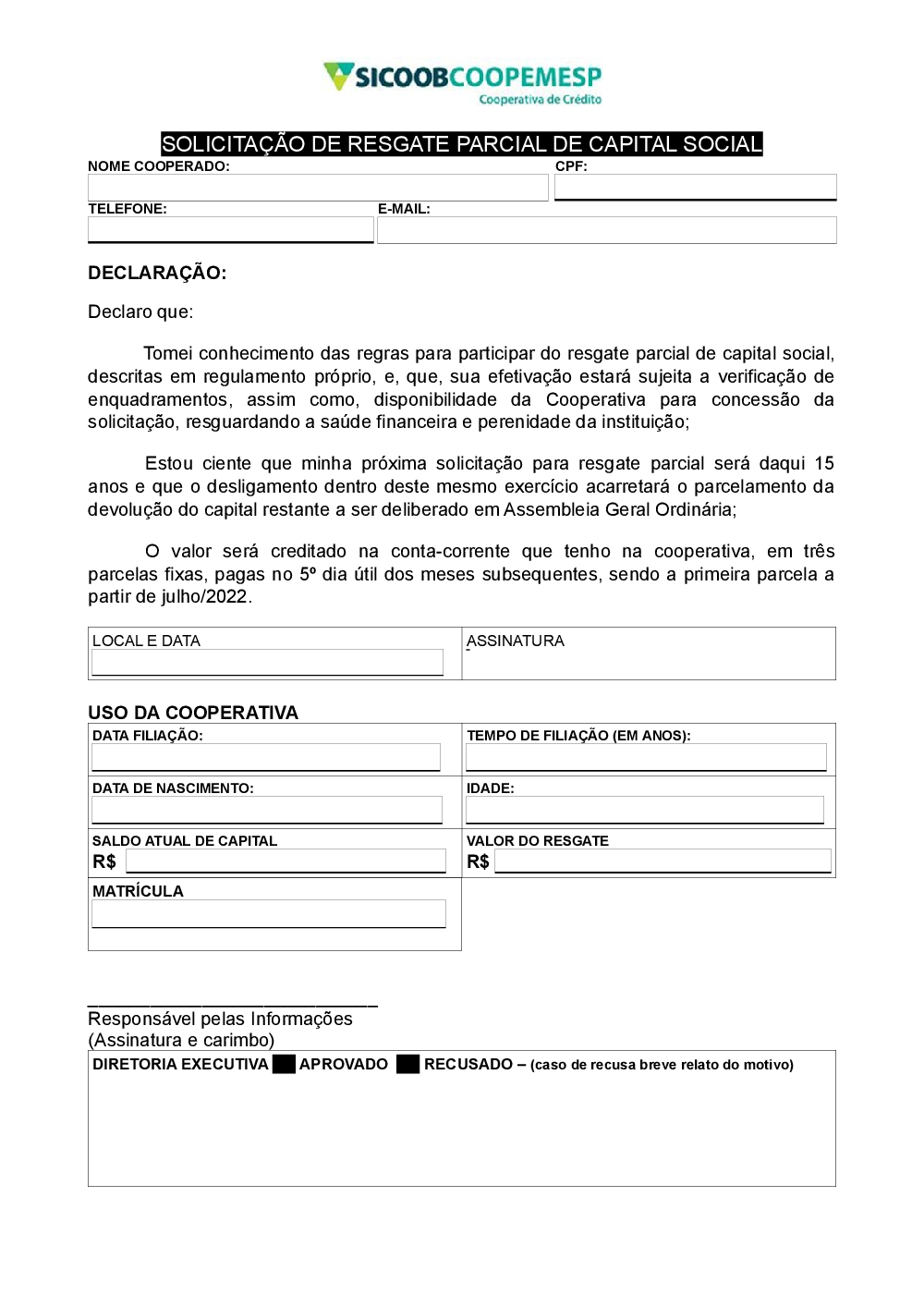 FORMULÁRIO SOLICITAÇÃO RESGATE PARCIAL CAPITAL SOCIAL
