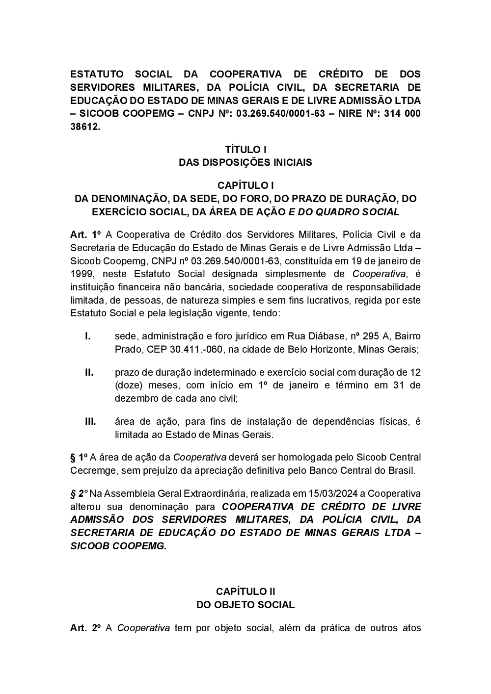 - Documento fundamental que reúne as normas que regem o funcionamento do Sicoob Coopemg. Nele estão definidos a estrutura organizacional, os direitos e deveres dos cooperados, os órgãos de administração e fiscalização, além dos princípios que orientam a atuação da cooperativa. O Estatuto assegura transparência, governança e segurança jurídica, refletindo a identidade e a missão da cooperativa criada por servidores da segurança pública.