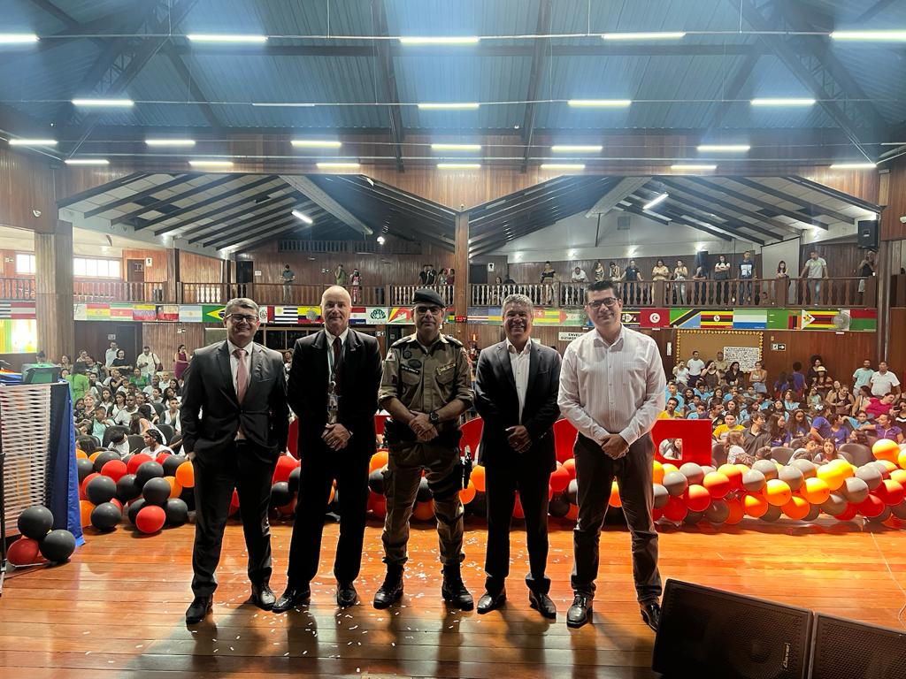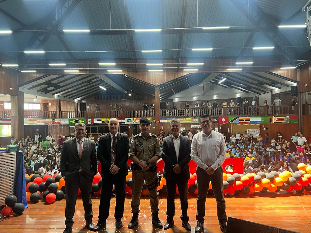 Durante o evento, o vice-presidente do Sicoob Coopemg, Tenente José Petrônio Costa, e o Diretor Administrativo, Jamerson César, fizeram a entrega da doação feita pela cooperativa a um aluno sorteado.