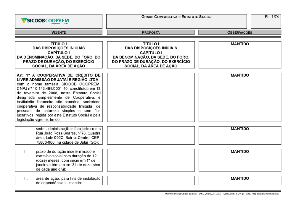 - Proposta de Estatuto Social para Assembleia Extraordinária e Ordinária 2025.