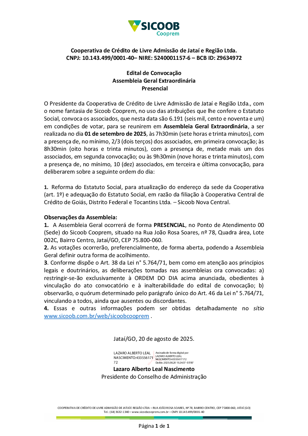 Edital de Convocação AGE Presencial - 01 de setembro de 2025